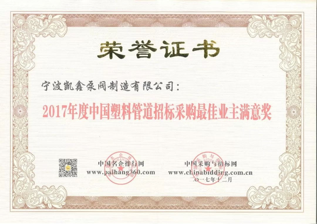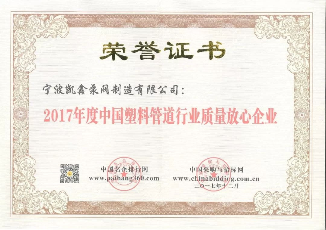 Mayroong higit sa 180 kumpanya na lumalahok sa aktibidad ng promosyon. Ang kabuuang bilang ng mga page view ng aktibidad ay halos 600W, at ang kabuuang bilang ng mga boto ay halos 200W . Ang Ningbo Kaixin Pump & Valve Manufacturing Co., Ltd. ay isa sa mahigit 180 kumpanyang ito. Mula sa pagsasama-sama ng impormasyon sa pagpaparehistro sa maagang yugto, hanggang sa araw-araw na walang tigil na pagboto ng lahat ng empleyado ng kumpanya sa kalagitnaan ng termino, hanggang sa komprehensibong pagsusuri ng mga kaugnay na institusyon at mga propesyonal sa huling yugto, ang Kai Xin Company ay napili at nanalo ng 3 parangal, katulad ng: "2017 Nangungunang Brand sa Plastic Pipe Industry ng China", "2017 China's As Plastic Pipe7 ng Plastic Pipe Bidding at Procurement" Satisfaction Award".