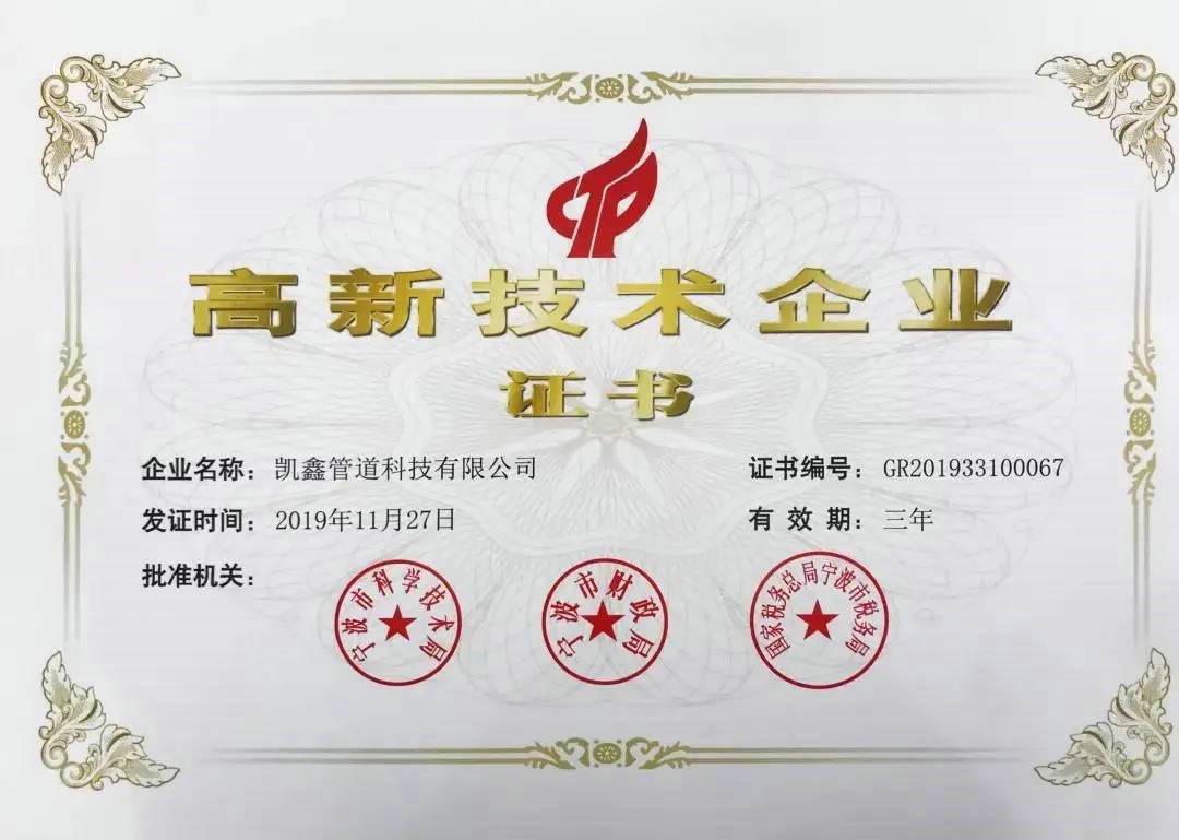 Sa ngayon, kumakalat ang bagong epidemya ng korona, ngunit hindi nito mapipigilan ang mabilis na pag-unlad ng kumpanya. Ang mabuting balita ay madalas na kumakalat-pagkatapos makuha ang "Polymer Pipe Valve Engineering Technology Center Certification" , Nakuha ni Kaixin ang "National High-tech Enterprise Certificate" , na nagpapakita ng superyor na lakas ng kumpanya sa pag-unlad.