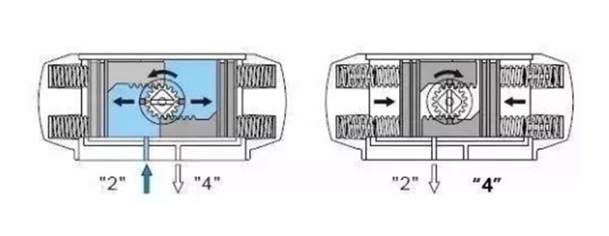 Kapag ang presyon ng pinagmumulan ng hangin ay pumasok sa lukab sa pagitan ng dalawang piston ng silindro mula sa air port (2), ang dalawang piston ay pinaghihiwalay at inilipat patungo sa mga dulo ng silindro, na pinipilit ang mga bukal sa magkabilang dulo upang i-compress, at ang hangin sa mga silid ng hangin sa magkabilang dulo ay ilalabas sa pamamagitan ng air port (4). I-synchronize ang dalawang piston rack upang himukin ang output shaft (gear) upang paikutin ang counterclockwise. Matapos ang air source pressure ay baligtarin ng solenoid valve, ang dalawang piston ng cylinder ay gumagalaw sa gitnang direksyon sa ilalim ng elastic force ng spring, ang hangin sa gitnang cavity ay discharged mula sa air port (2), at ang dalawang piston rack ay sabay na nagtutulak sa output shaft (gear) I-rotate ang clockwise. (Kung ang piston ay naka-install sa tapat na direksyon, ang output shaft ay liliko sa reverse rotation kapag ang spring ay na-reset).