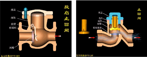 Ang mga check valve ay maaaring nahahati sa swing check valves (umiikot ayon sa sentro ng grabidad) at lift check valves (gumagalaw kasama ang axis). Ang elevator check valve ay katulad ng istraktura sa shut-off valve, ngunit kulang ang valve stem na nagtutulak sa disc. Ang daluyan ay dumadaloy mula sa dulo ng pumapasok (ibabang bahagi) at umaagos palabas mula sa dulo ng labasan (sa itaas na bahagi). Kapag ang presyon ng pumapasok ay mas malaki kaysa sa kabuuan ng bigat ng disc at ang resistensya ng daloy nito, bubuksan ang balbula. Sa kabaligtaran, ang balbula ay sarado kapag ang daluyan ay dumadaloy pabalik. Ang swing check valve ay may disc na nakahilig at maaaring umikot sa paligid ng axis, at ang prinsipyo ng paggana ay katulad ng sa lift check valve. Ang check valve ay kadalasang ginagamit bilang ibabang balbula ng pumping device upang pigilan ang backflow ng tubig. Tulad ng shut-off valve, makitid din ang pagdaan ng fluid sa elevator check valve, kaya mas malaki ang pressure drop sa elevator check valve kaysa sa swing check valve, at ang flow rate ng swing check valve ay pinaghihigpitan. Bihira. Ang kumbinasyon ng check valve at stop valve ay maaaring gumanap ng isang papel ng kaligtasan ng paghihiwalay. Ang kawalan ay ang paglaban ay malaki at ang pagganap ng sealing ay mahina kapag sarado.